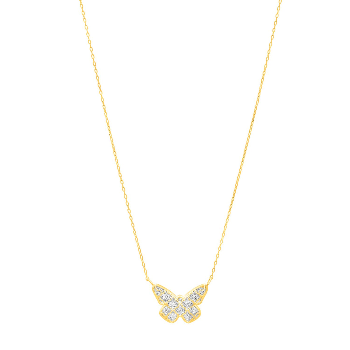 This 14k yellow gold necklace features a butterfly pendant gracefully suspended on an 18 inches chain. The pendant's diamond-cut, checkered pattern adds texture and dimension. Its radiant finish and intricate detailing create a visually striking piece that is a delightful expression of artistry. Secured with a Spring Ring clasp closure.