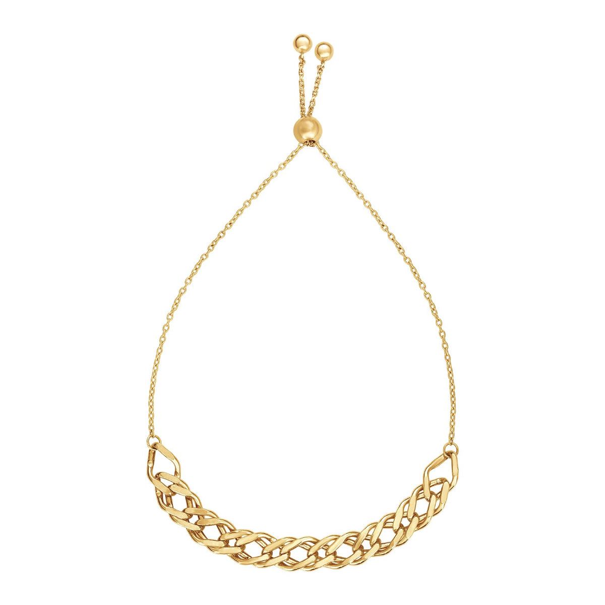 This adjustable gold bracelet features the contrasting shine of twisted gold links. Bracelet is 9 1/4 inches long and adjusts with a drawstring clasp.