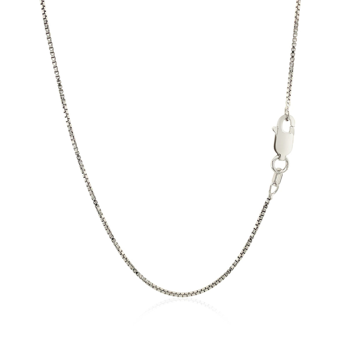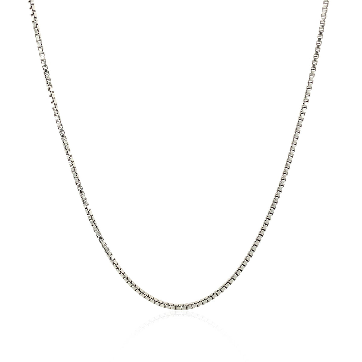 This rhodium-plated box chain comes in sterling silver and has a width of 1.10 millimeters.
