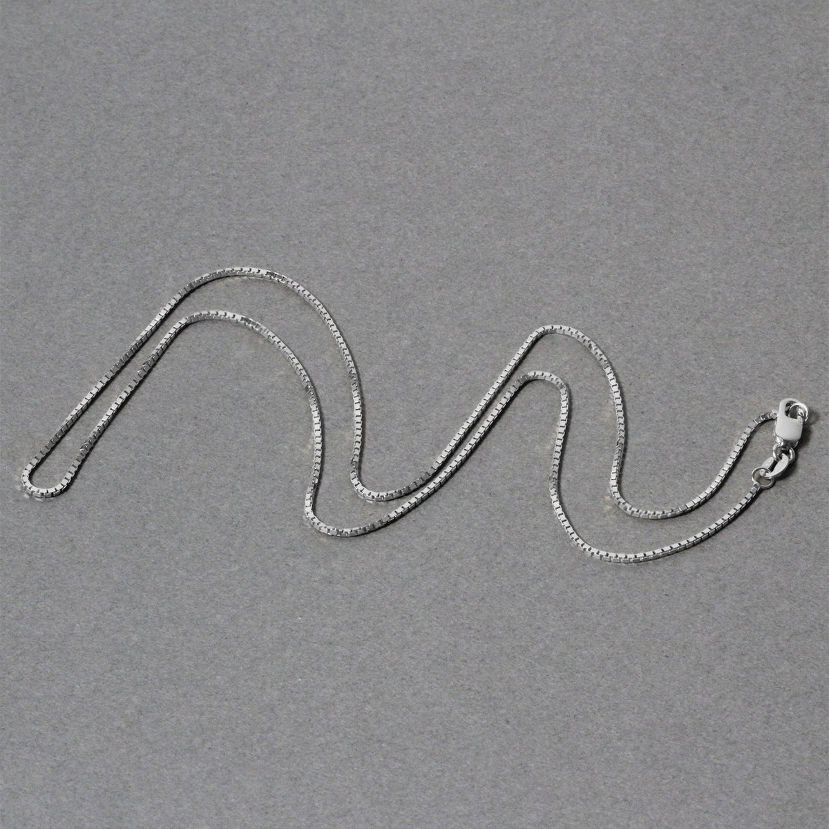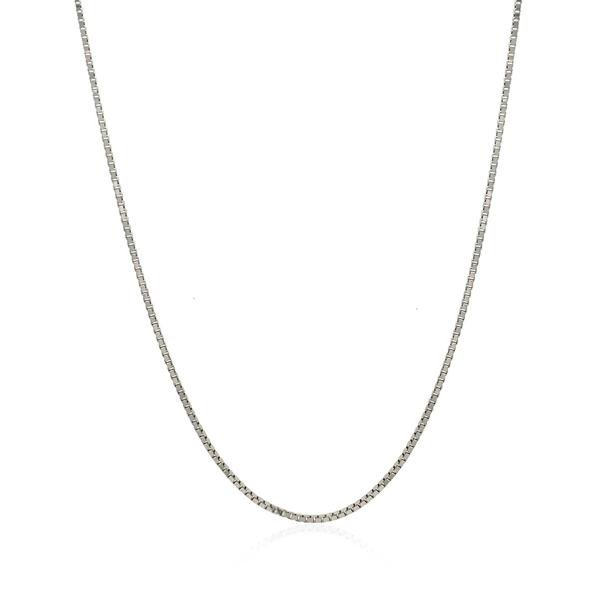 This classic box chain comes in 14k white gold and has a width of 0.85 millimeters.