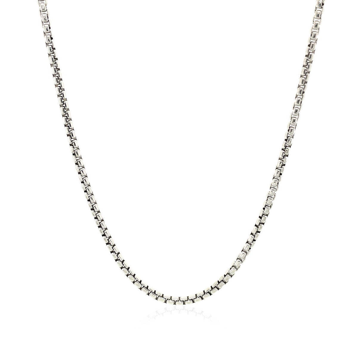 This round box chain comes in 14k white gold and has a width of 1.8 millimeters.