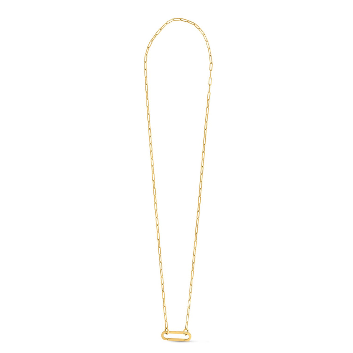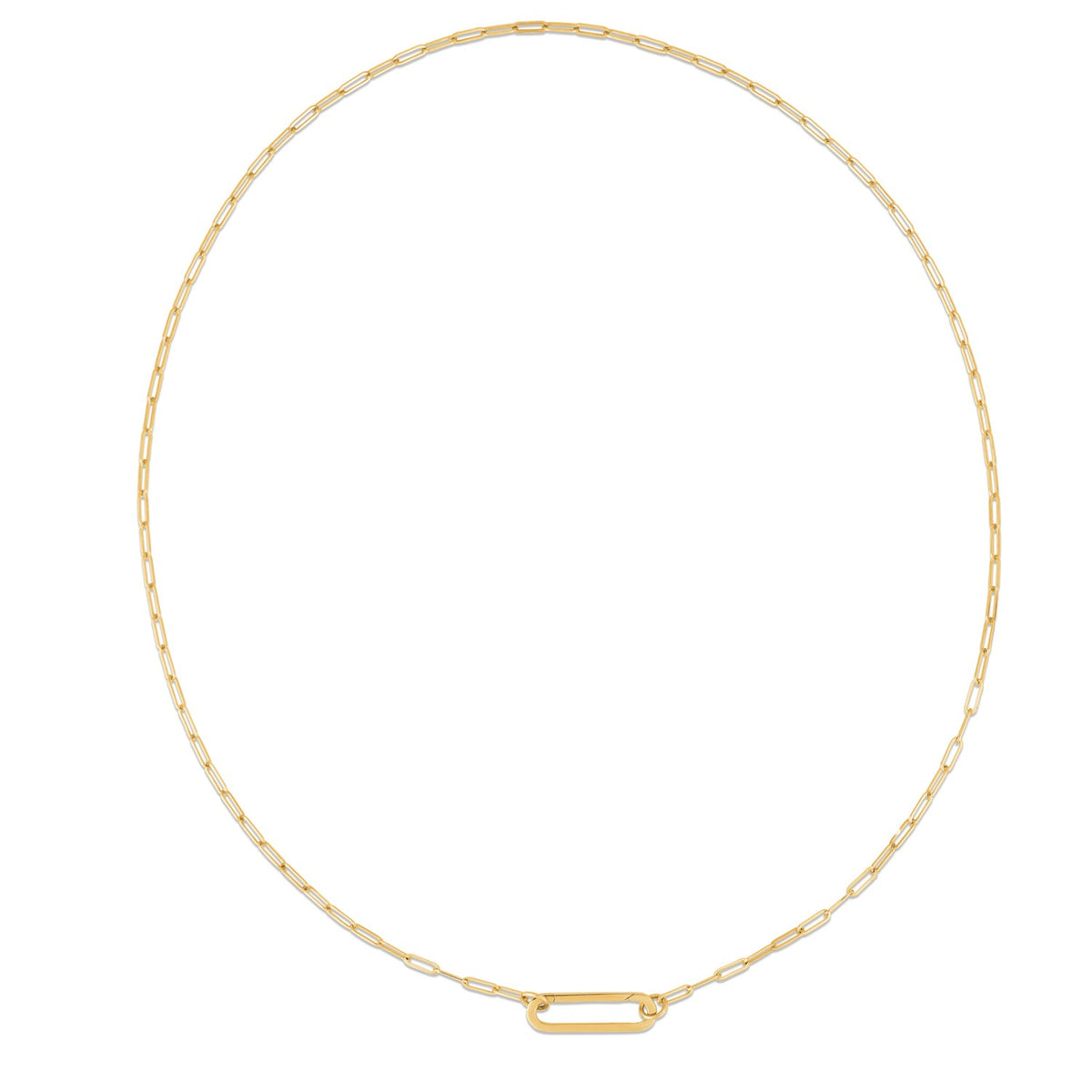 The Elongated Link Paperclip necklace is a unique addition to complete your look & express your style. Crafted in 14k yellow gold with a high polish finish & push lock clasp. Measuring 18 inches in length.