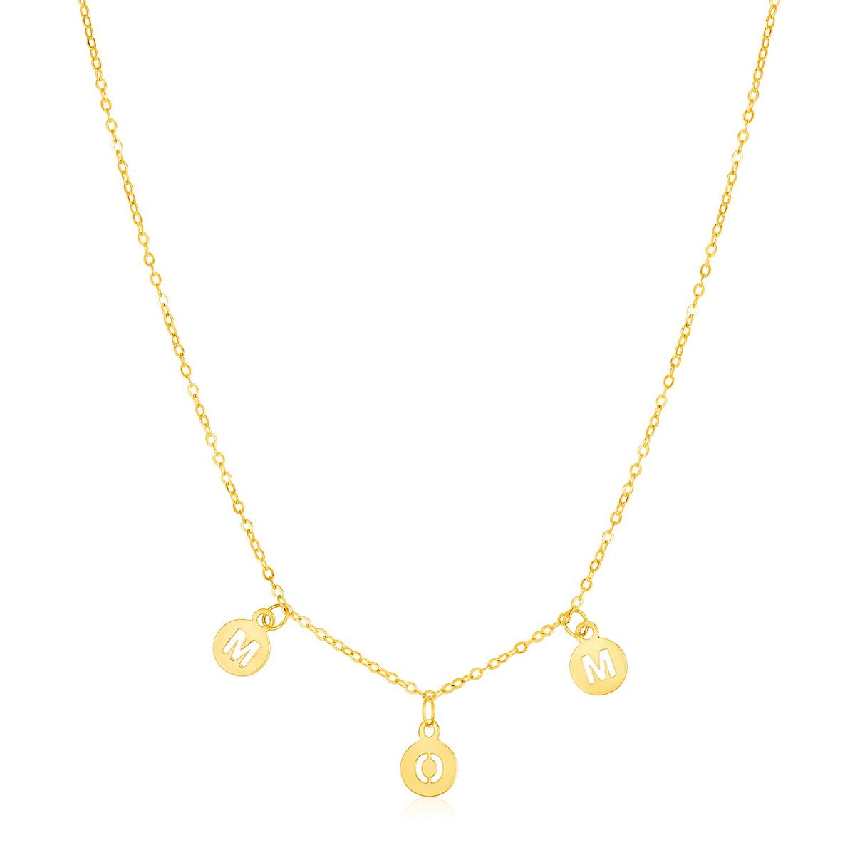 Wear motherhood with pride and love with this exquisite 14k yellow gold necklace, featuring sweet circle drops that spell "Mom". Necklace is 18 inches long.