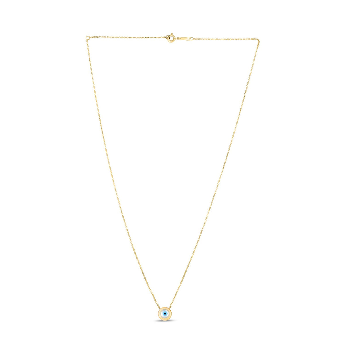 This beautiful 14k yellow gold Mother Of Pearl Evil Eye necklace comes in a high polish finish & closes with a spring clasp. This stunning piece is hand crafted & sits effortlessly between a glimmering rolo chain. Uniquely balanced in the center is a beautiful piece of Mother of Pearl that adds that pop of color to anyones collection. Measuring 18 inches in length.