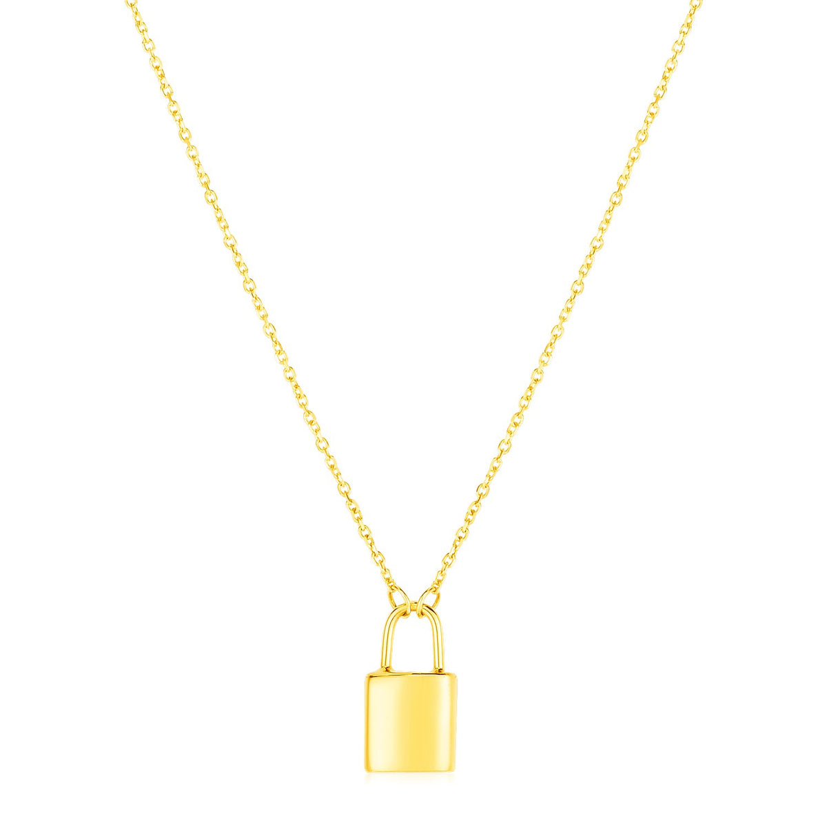 A stunning, polished 14k yellow gold padlock hangs from exquisite chain to create this impressive and heartfelt necklace. Necklace is 18 inches long.