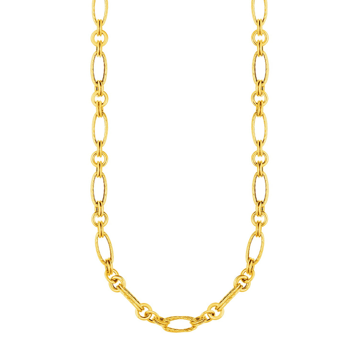 Light and shine play beautifully against the elegant shine of circles and the modern texture of twisted ovals in this stunning 14k yellow gold necklace. Necklace is 18 inches long and closes with a lobster clasp.