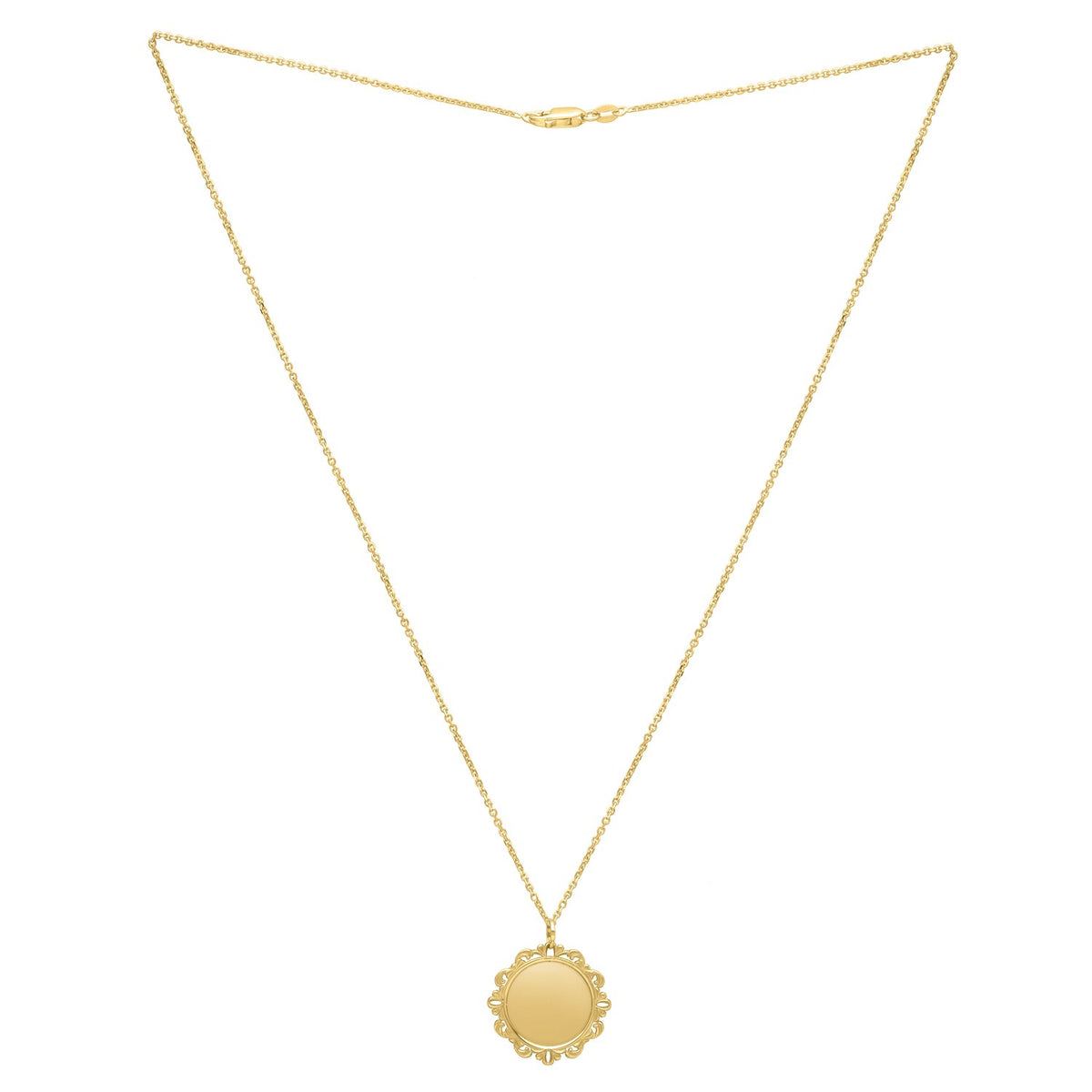 With intricate lace-like detailing, this 14k yellow gold baroque round pendant transforms the classic circle into a captivating work of art. The polished yellow gold finish enhances its delicate design, while the 18 inches chain provides the perfect complement. A timeless piece for those who appreciate fine detail and artistic elegance. Secured with a lobster clasp closure.