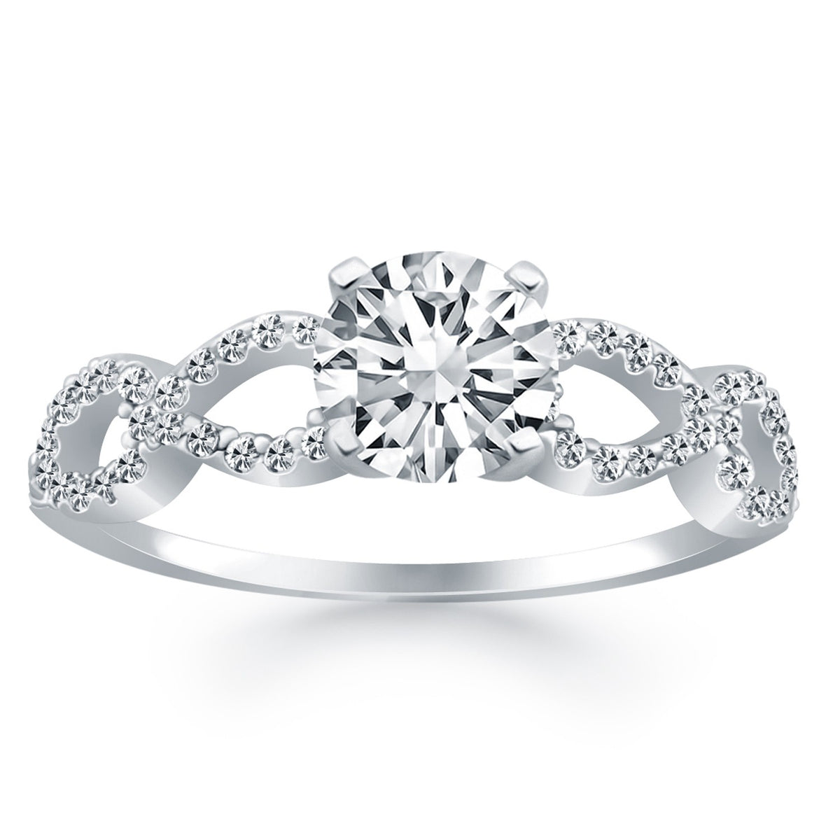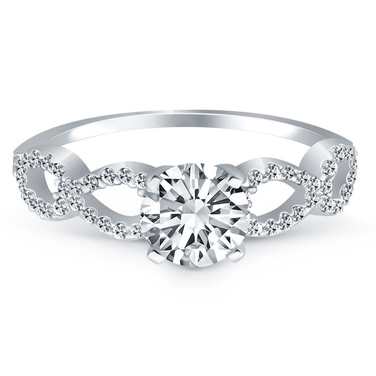 The open interwoven infinity signs add symbolic significance to this elegant engagement ring. Expertly crafted in 14k white gold, the center highlights a sparkling 1/2 carat round cut diamond.