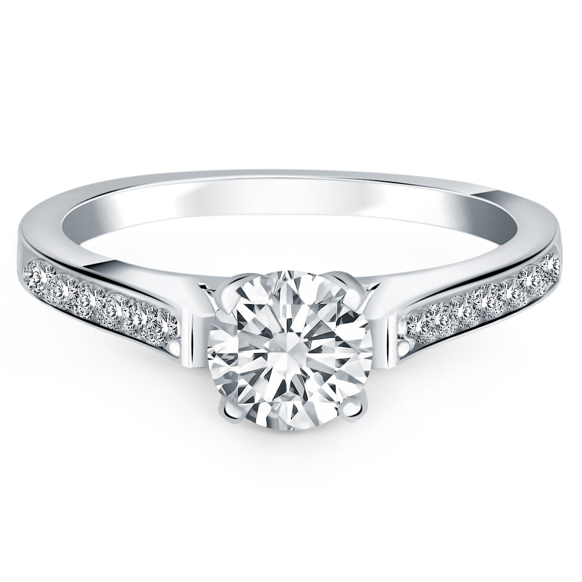 The classic cathedral silhouette is encrusted with pave set diamonds across the front of the ring shank in this graceful and elegant engagement ring. Expertly crafted in 14k white gold, the smoothly polished borders of the pave diamonds add a tailored look. The center highlights a sparkling 1/2 carat round cut diamond.