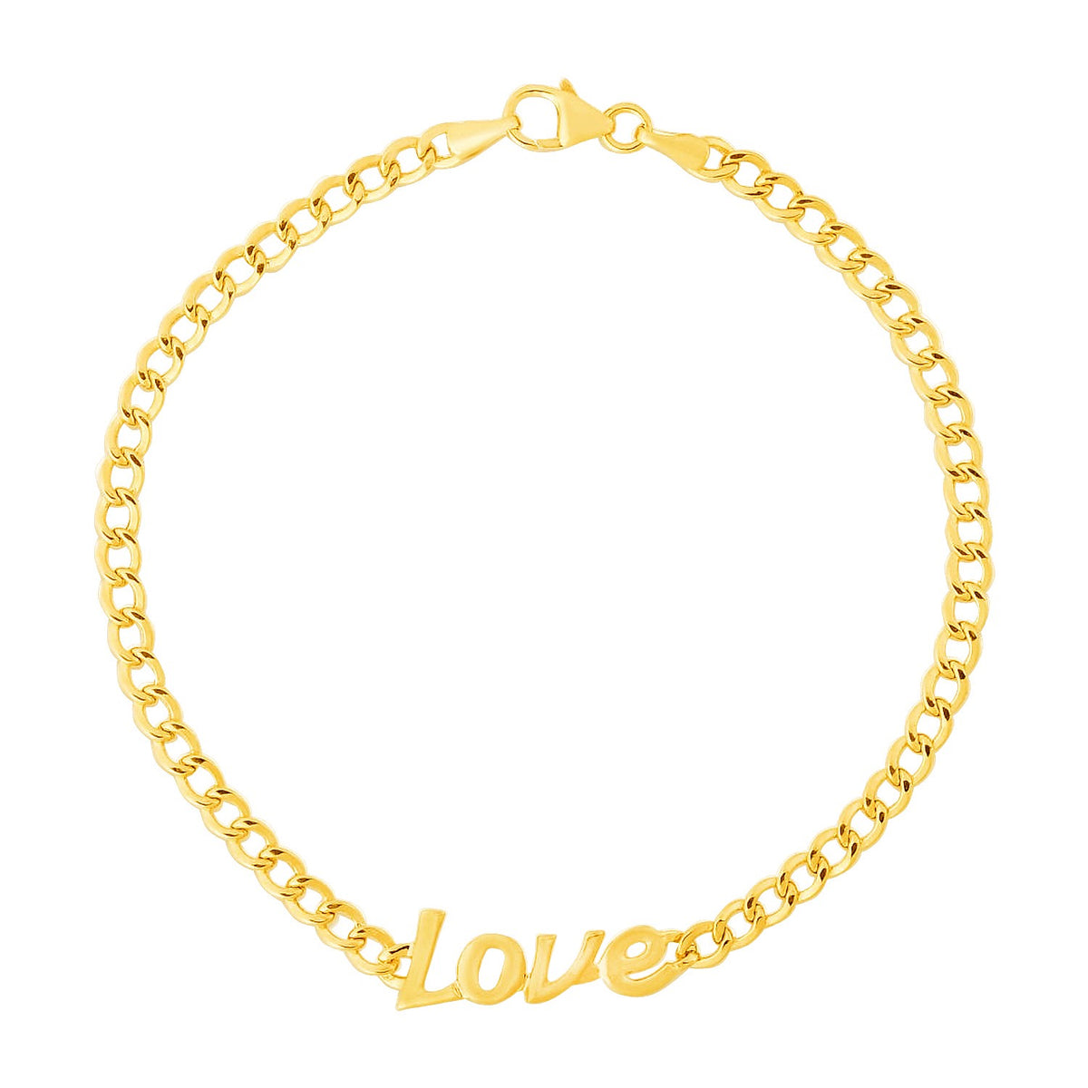 Wear love with you always with this elegant "love" bracelet, joined to classic curb chain and formed from 14k yellow gold. Bracelet is 7 inches long and closes with a lobster clasp.
