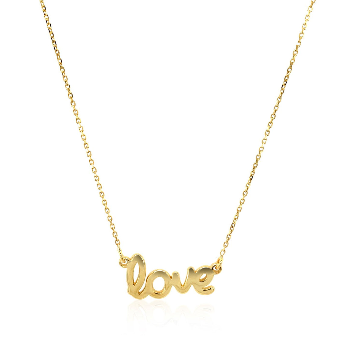 The beautifully crafted LOVE in script style highlights the charming look of this chain necklace. Crafted in 14k yellow gold and measures 18 inches.