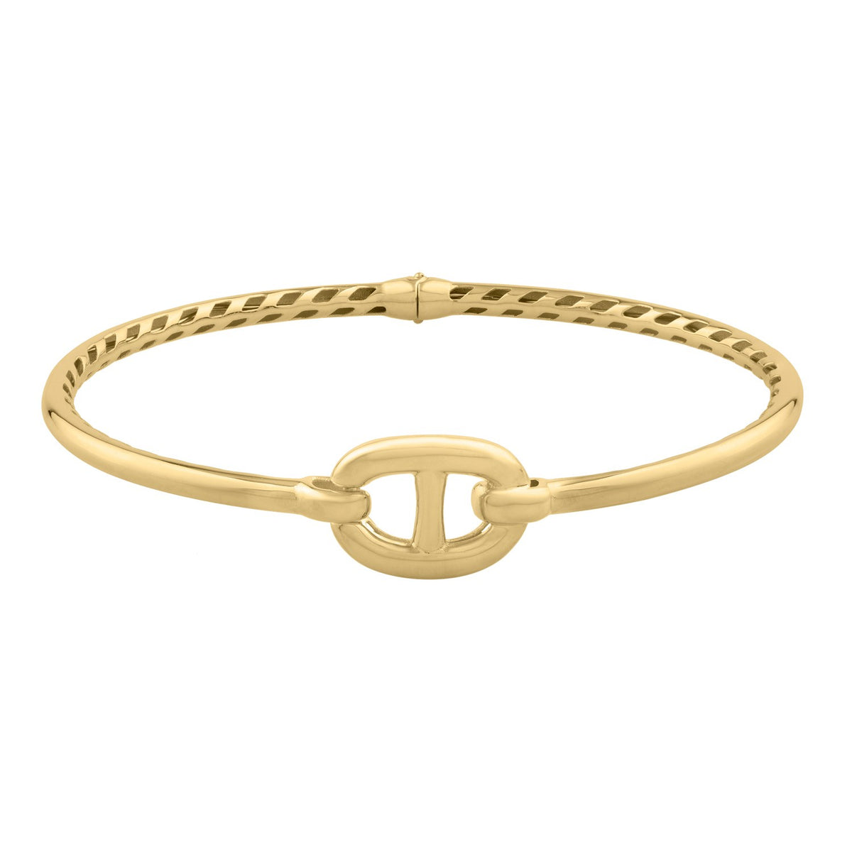 14k yellow gold mariner link bangle with a polished surface, adorned with a small knot and a reliable snap clasp.