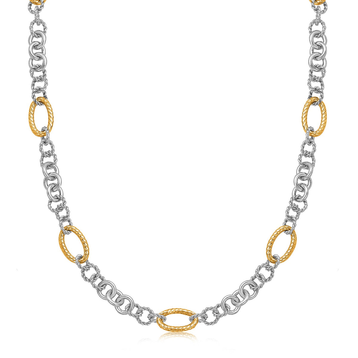 A classic 18 inches necklace that exudes striking grace with its oval textured 18k yellow gold stations showcasing a link of chains in two different styles, this rhodium-plated beauty is sure to make any outfit extra memorable.