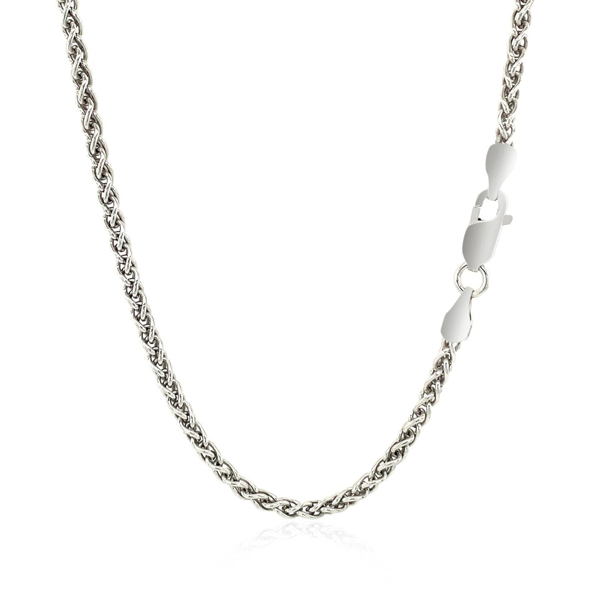 This rhodium-plated wheat chain comes in sterling silver and has a width of 2.6 millimeters.