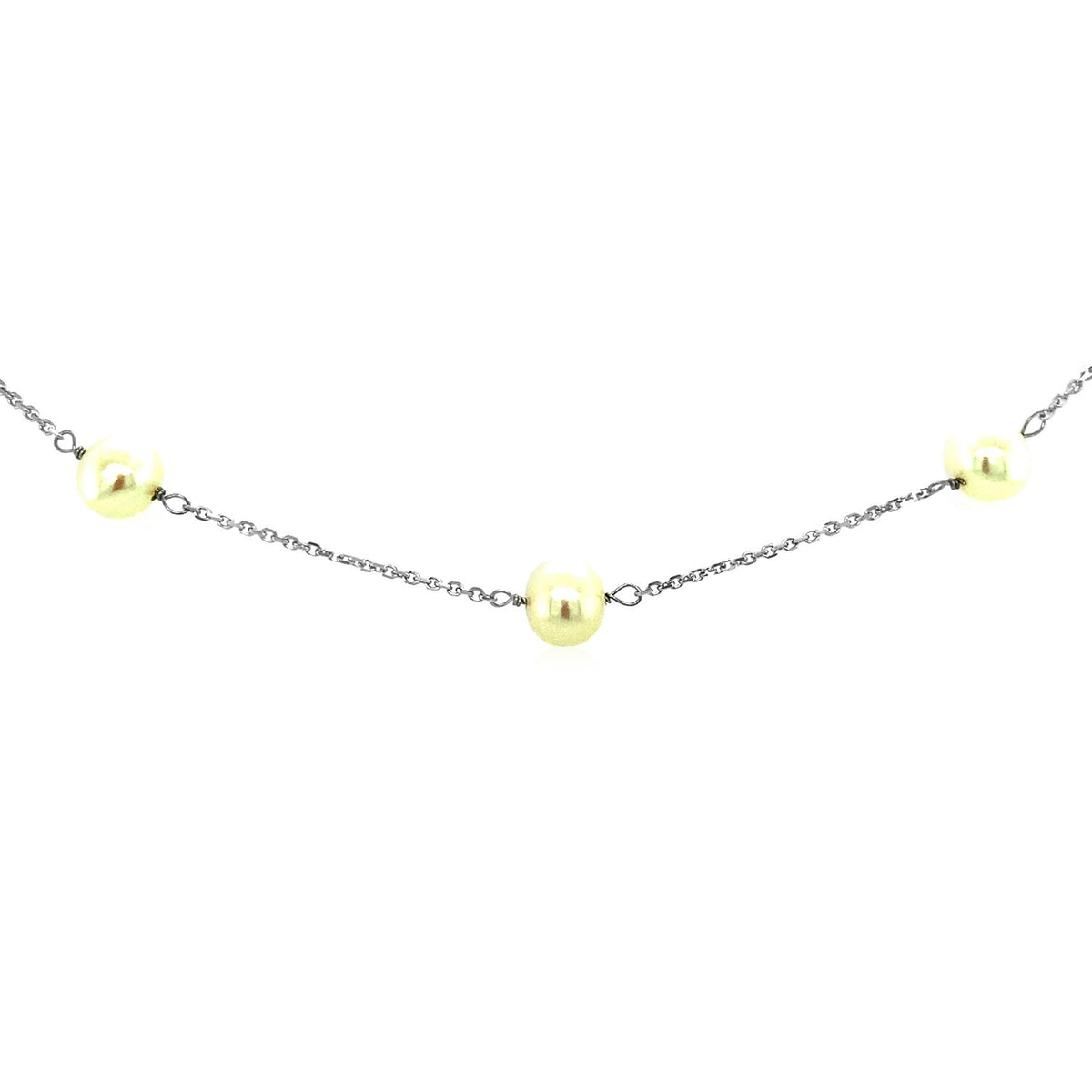 Lengths of delicate 14k white gold chain beautifully combine with classic, elegant white pearls to create this stunning necklace. Necklace is 16 and 18 inches long and closes with a spring ring clasp. Pearls each measure 6 to 6.5mm.