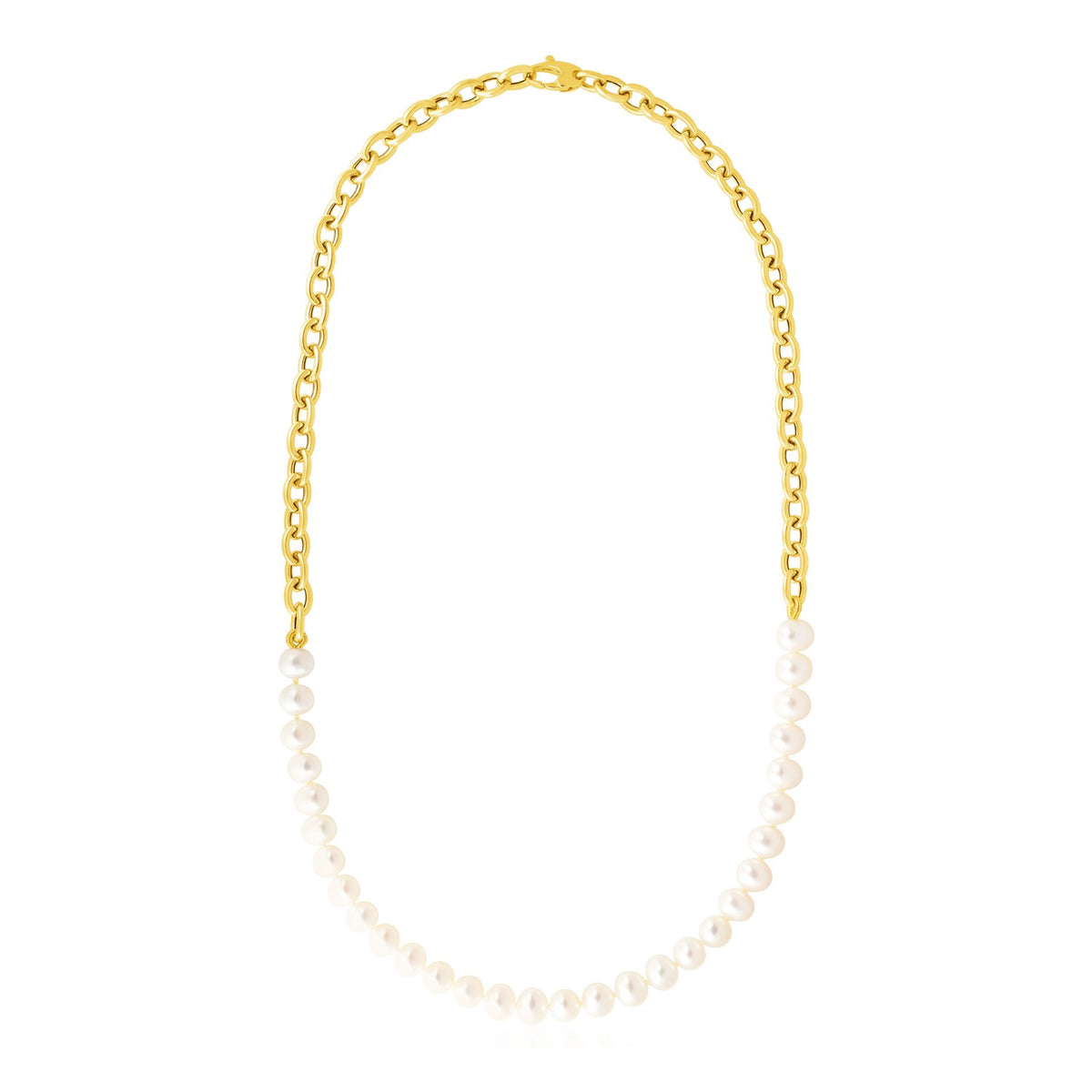 An inspiring row of pearls contrasts elegantly with luminous 14k yellow gold chain links in this stunning and unique necklace. Necklace is 18 inches long and closes with a lobster clasp.