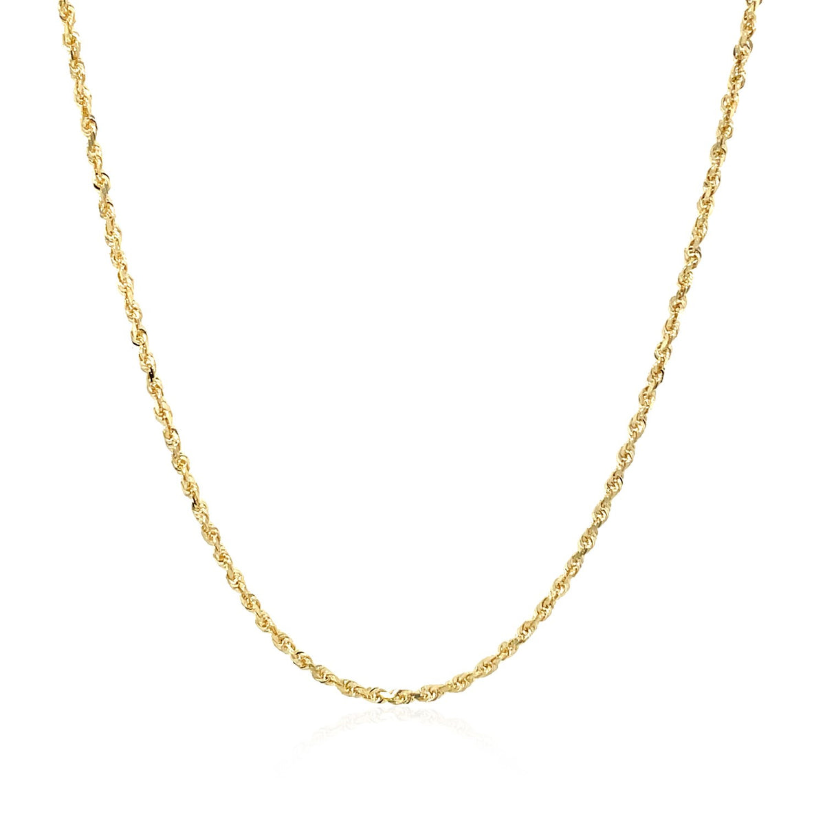 This solid diamond cut rope chain comes in 14k yellow gold and has a width of 1.4 millimeters.