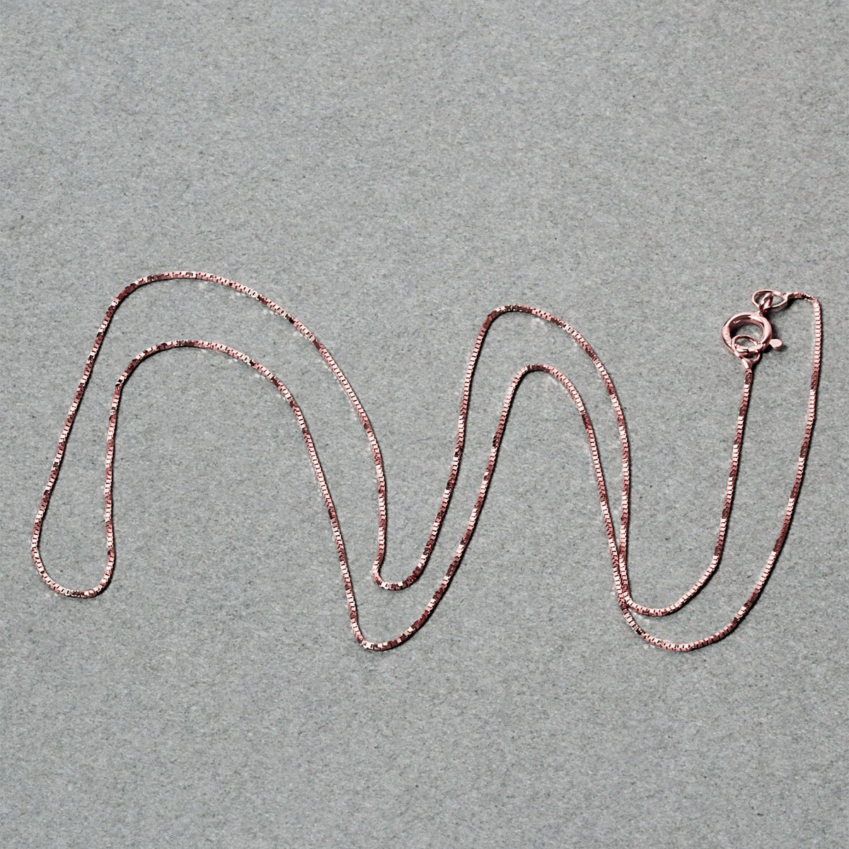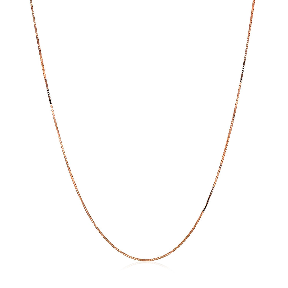 This classic box chain comes in 14k rose gold and has a width of 0.45 millimeters.
