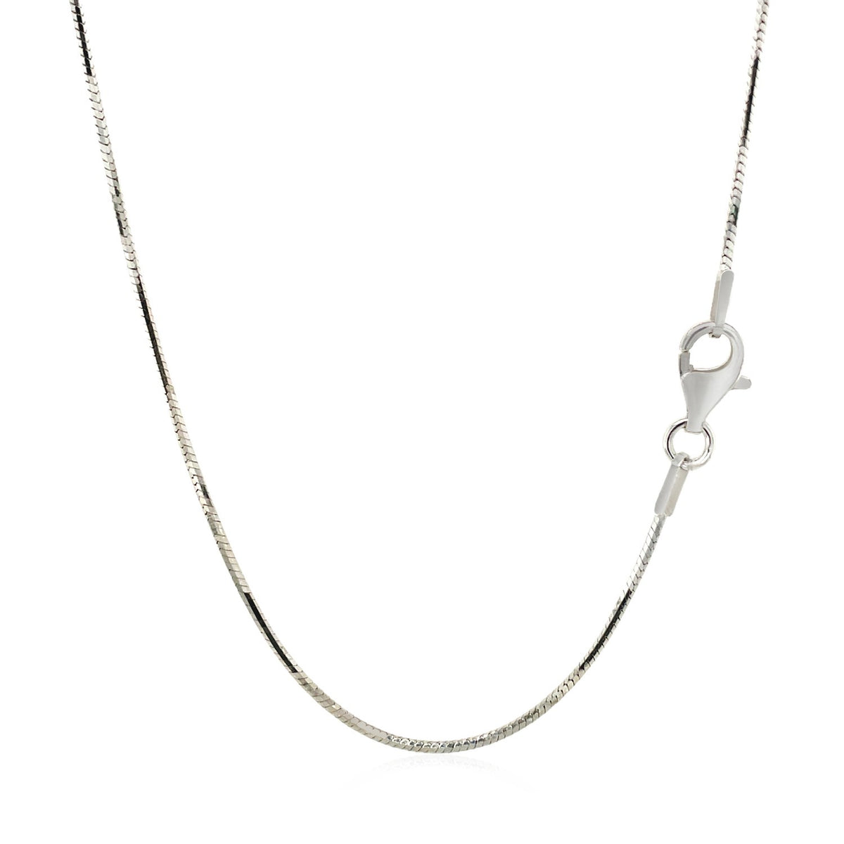 This rhodium-plated octagonal snake chain comes in sterling silver and has a width of 1.10 millimeters.