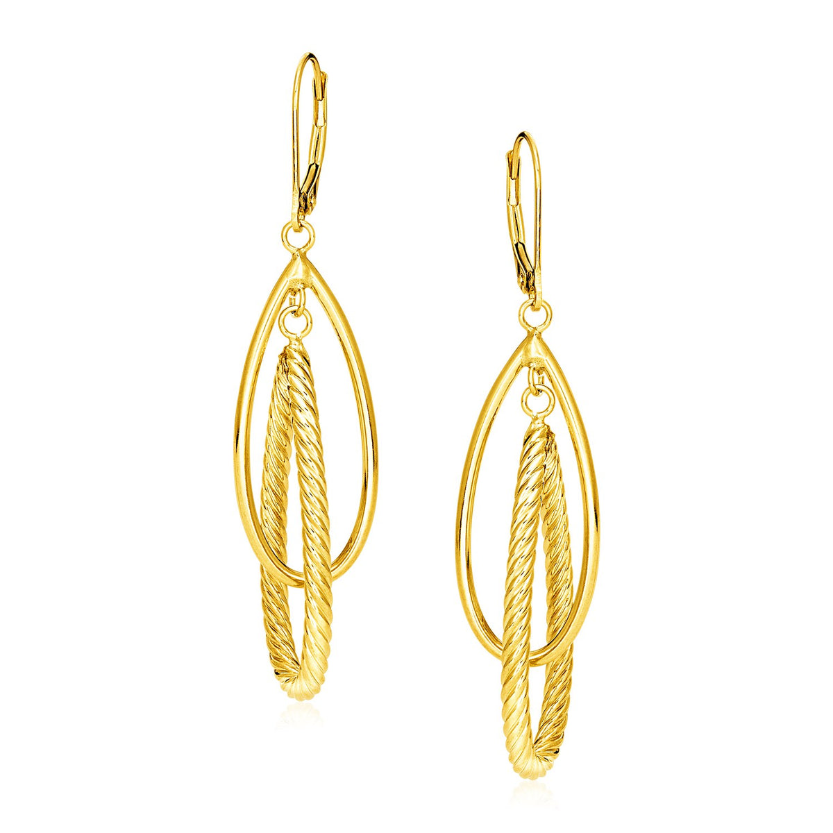 Sophistication meets nautical-inspired texture in these gorgeous 14k yellow gold earrings with interlocking pear-shaped shapes, one highly polished and one with a ropelike texture. Earrings are 55mm long and are held in place by lever back clasps.
