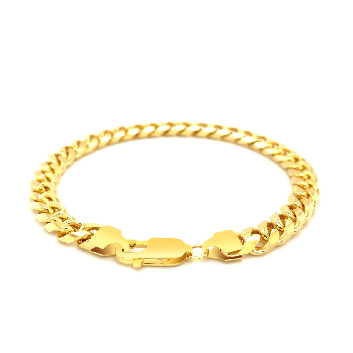 This solid Miami Cuban bracelet comes in 14k yellow gold and has a width of 6.7 millimeters. Secured with a lobster clasp.