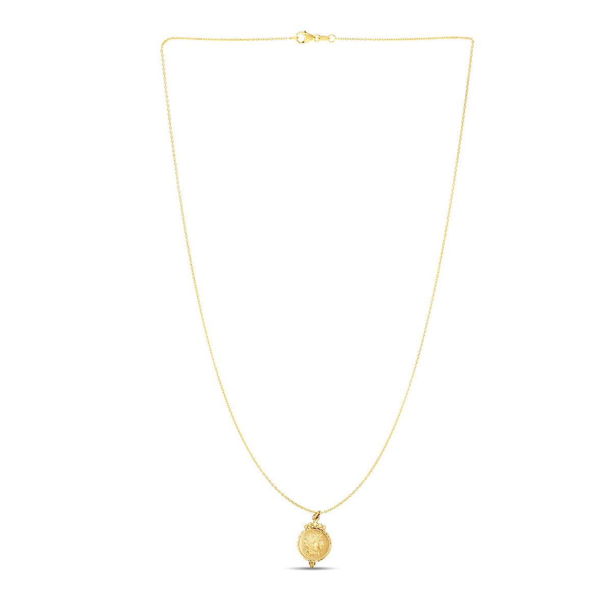 This timeless, regal 14k yellow gold features a round, decorated Roman coin pendant. Pendant is 18 inches long and closes with a lobster clasp.