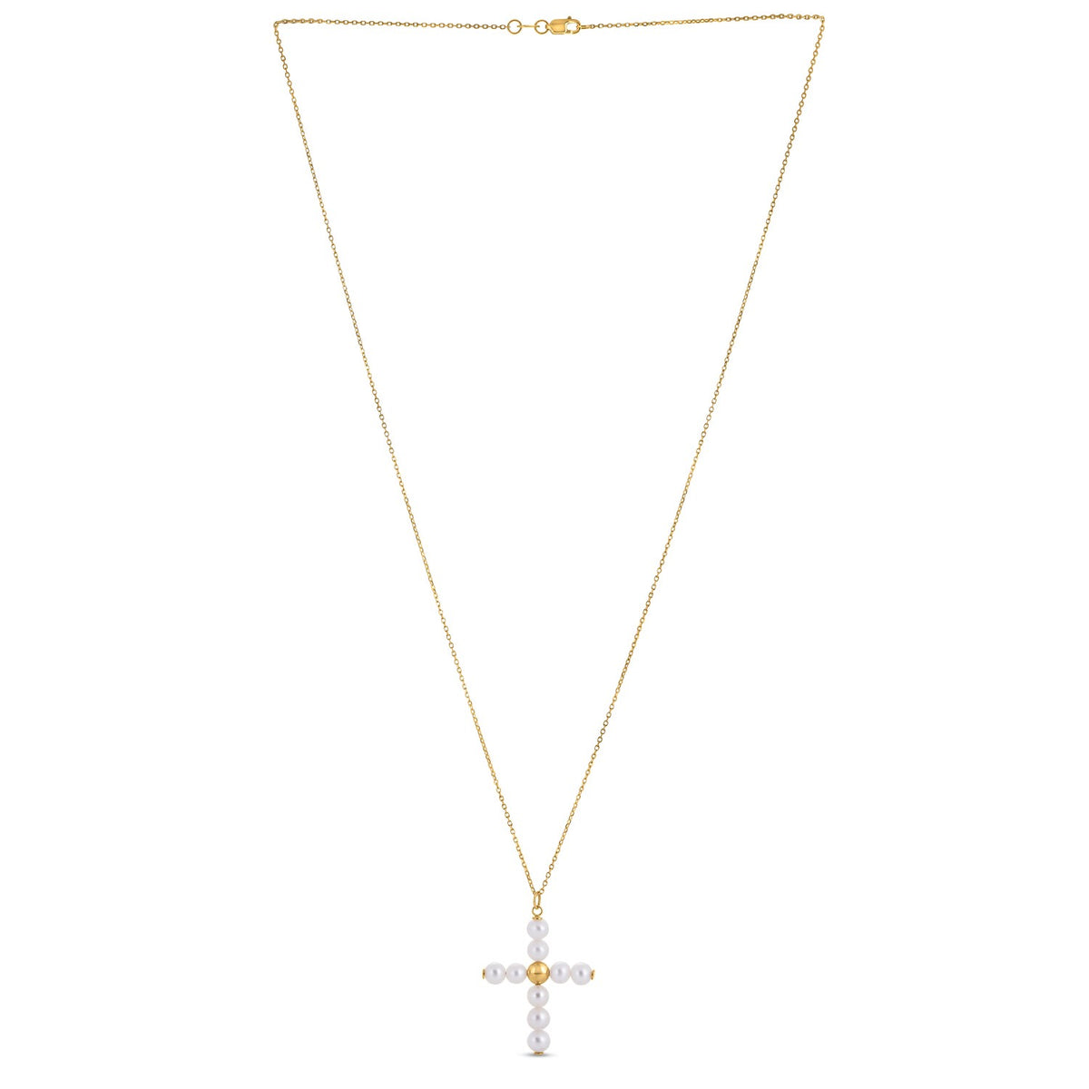 This Pearl Cross pendant is a delicate piece to add to anyone's collection. Great for layering or wearing independently. Crafted in 14k yellow gold with a high polish finish & a lobster closure. Dainty pearls & gold beads make this pendant irresistible. Measures 18 inches.