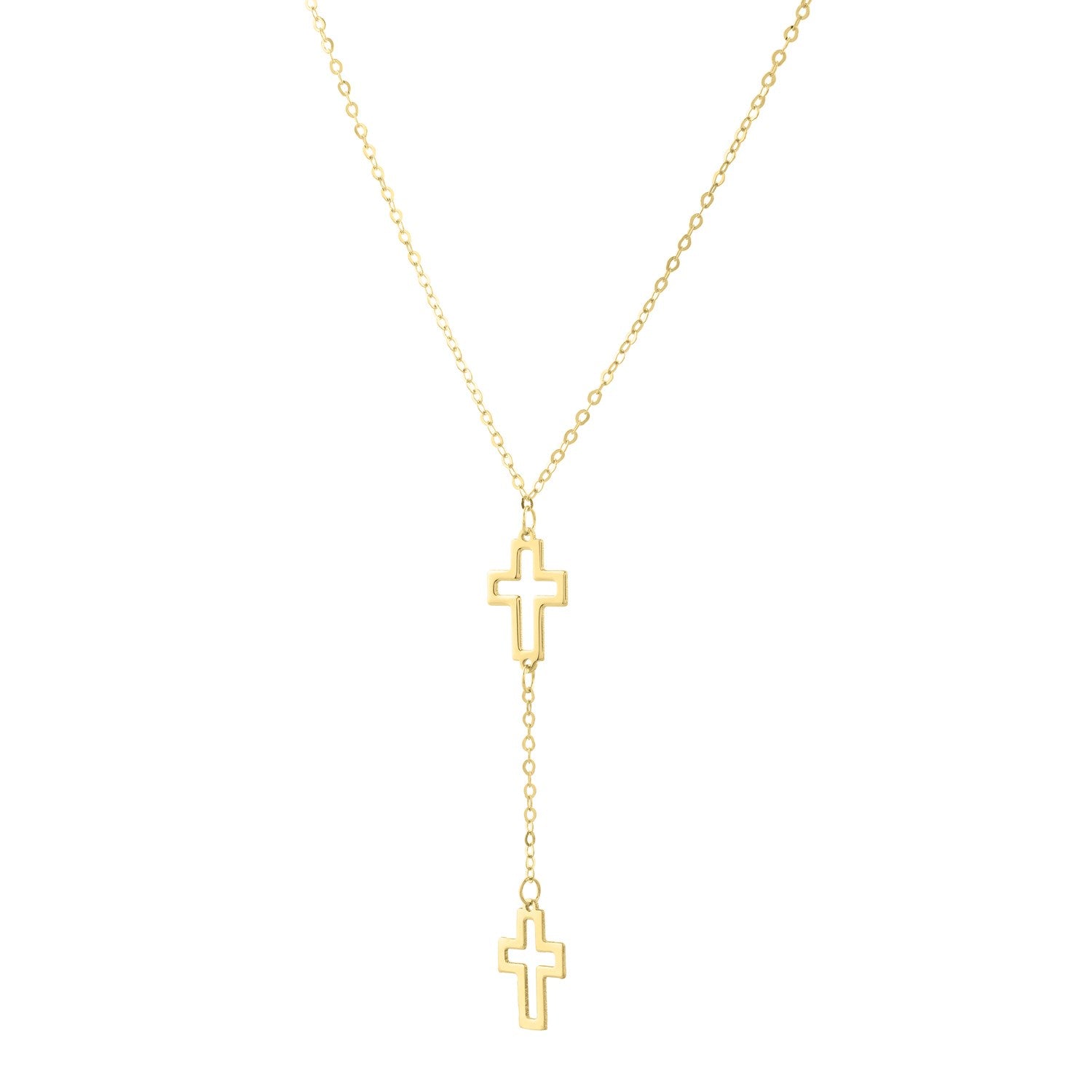 This 14K yellow gold double cross-drop necklace is a graceful expression of faith and style. Featuring two finely outlined cross pendants that hang in perfect harmony, the design is both minimalist and meaningful. Suspended from a simple gold chain, this necklace embodies timeless elegance and is a subtle yet powerful symbol of devotion. Secured with a lobster clasp closure available in an 18 inches length.